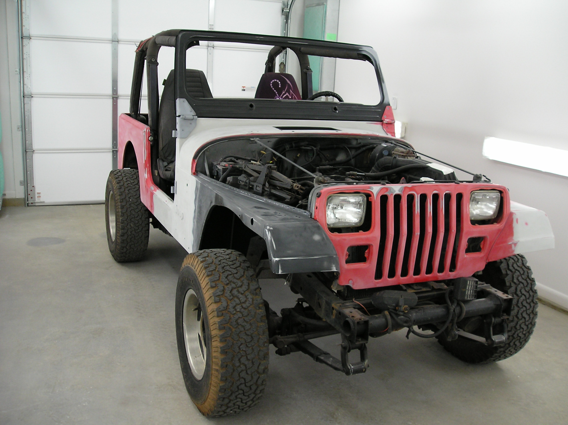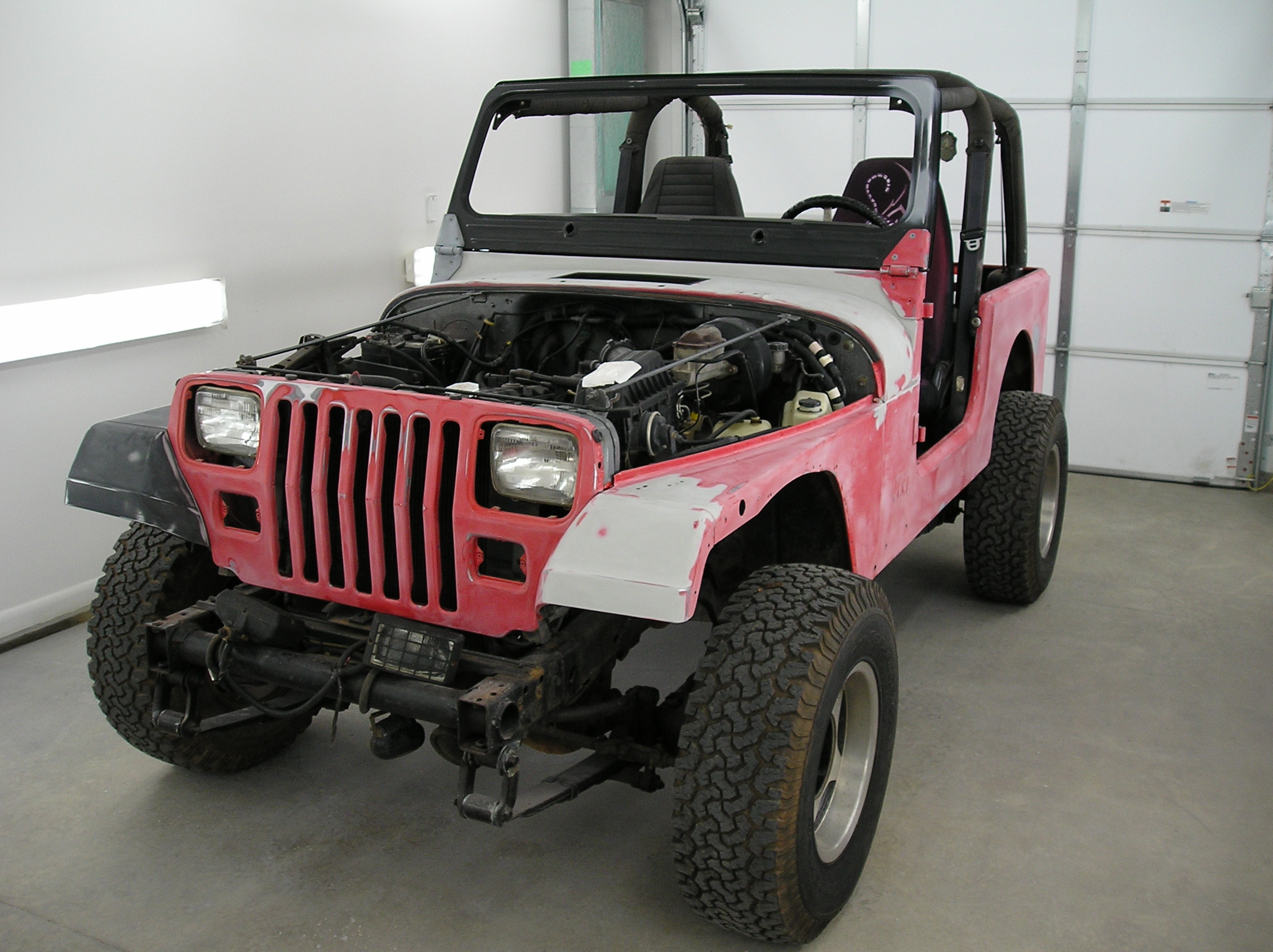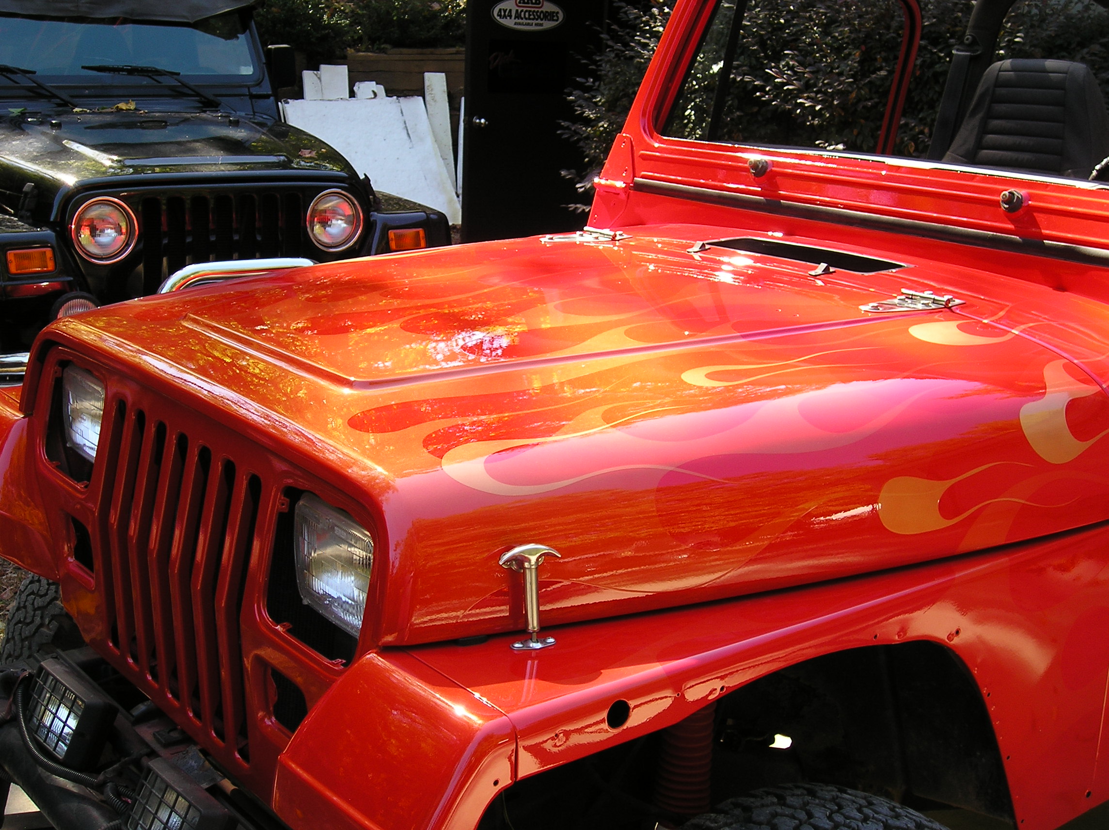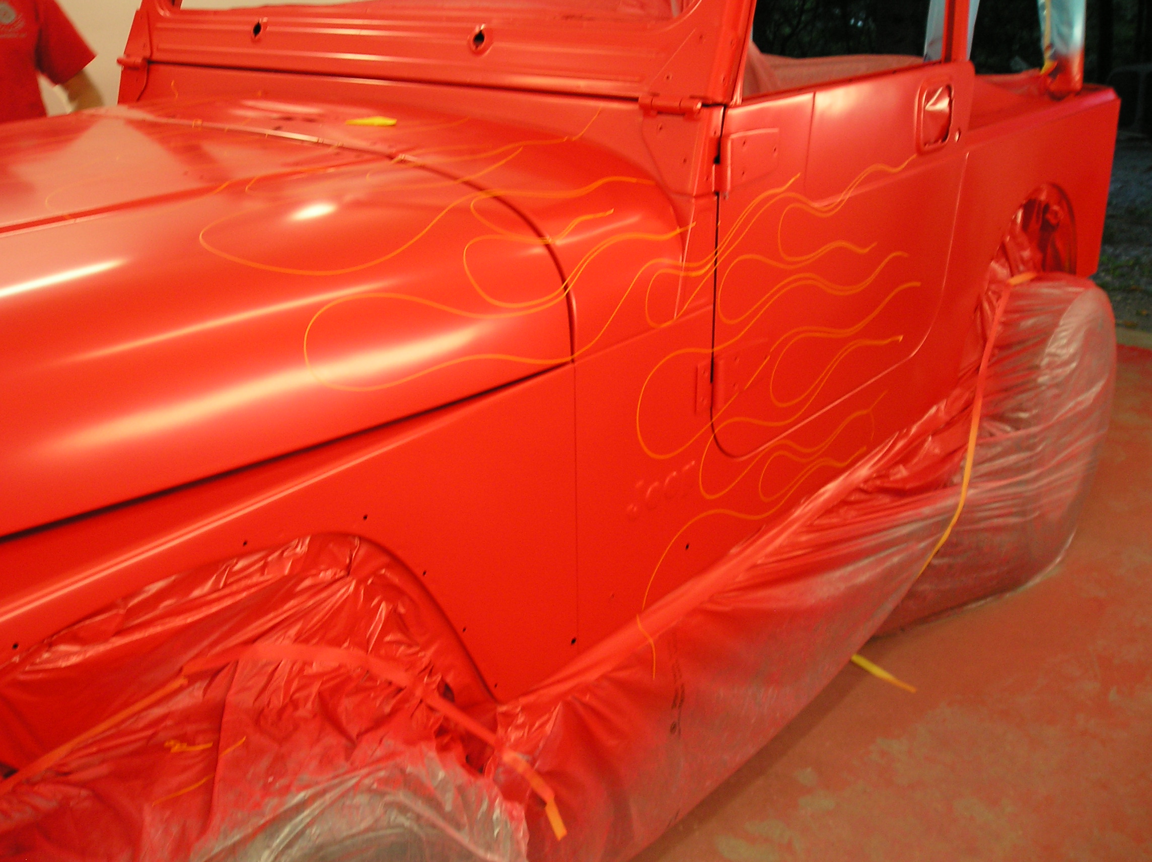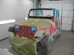 | We sold this YJ Wrangler several years ago and the customer recently brought it to us for some collision repair. It took a light roll to the passenger side. We fixed the damage, repainted it Viper Red and added ghost flames. This customer did the tear down and reassembly phases themselves. |